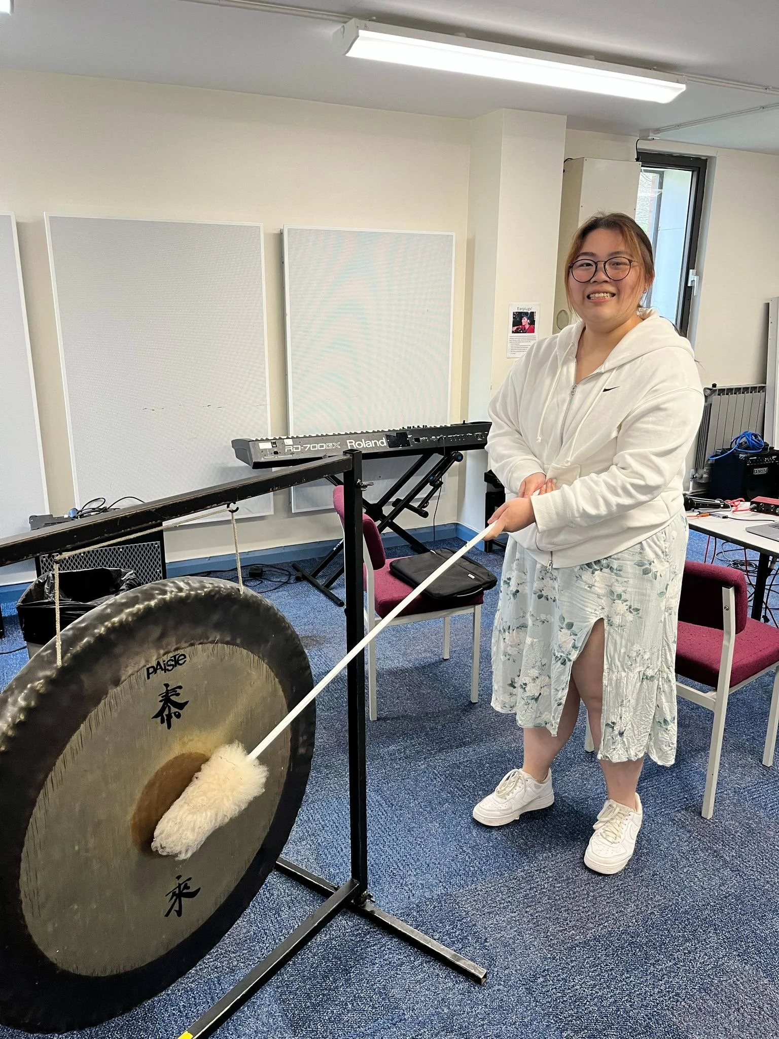 After hearing my suggestion, Genie found it rather crazy to record a gong sound which she have no idea where to find one. As I know where the gong is in Pats and I got very curiosity to record a gong. Therefore, I suggested that we should do it at the moment as we have quite a bit of time left. Genie and I moved the gong from Studio One to Pa11, however, we did not mange to find the gong stick. Thereby, we made use of our creativity to find things that can replace a gong stick but does not hurt the gong at the same time. At the end, we found a duster next to the stores> we understand that is not ideal but the duster was our only choice at that moment. It also remembles a gong sick with the soft bit on top of a stick.