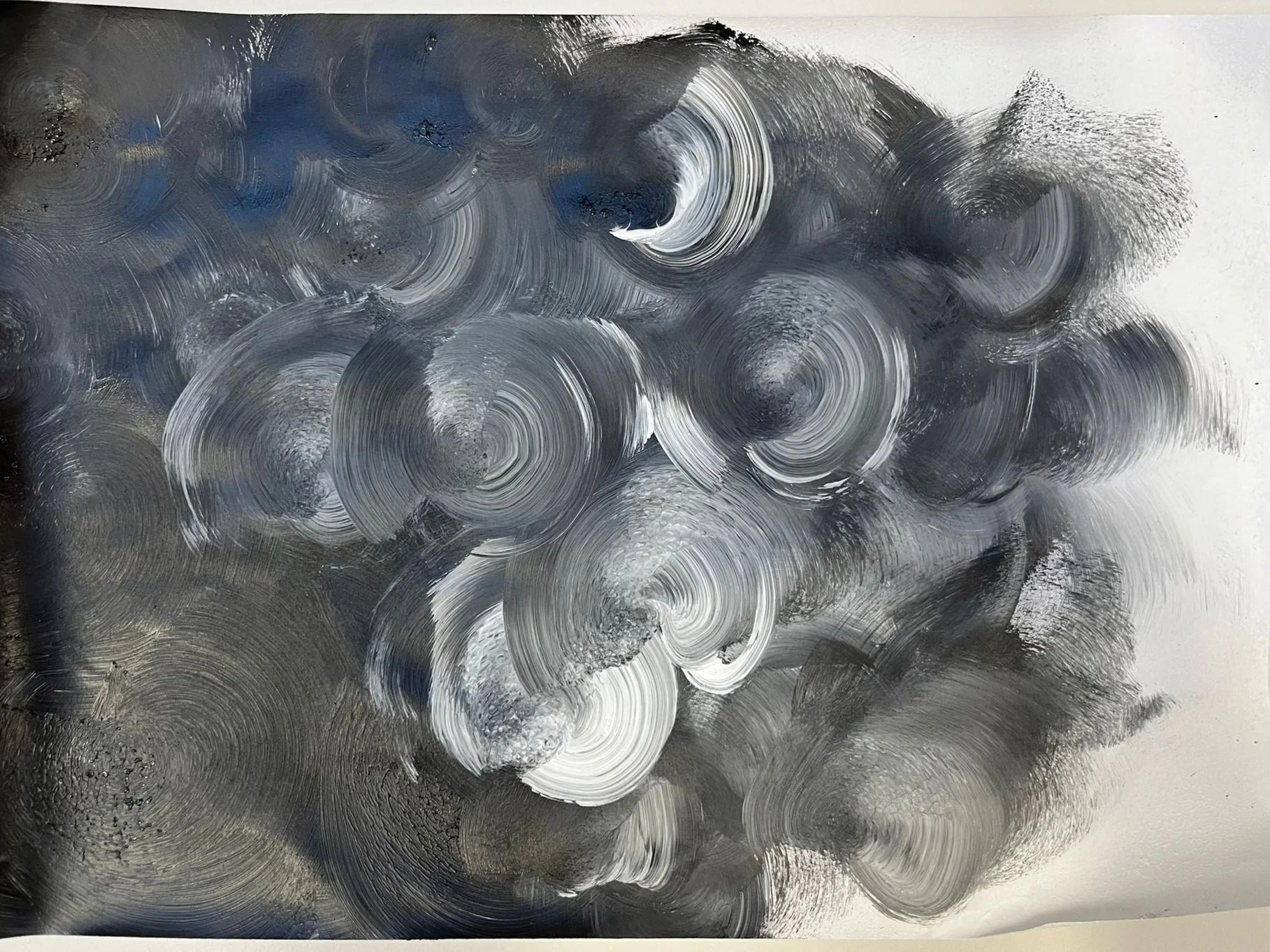 To be very honest I didn’t put in too much on how I should construct these pieces, I just follow my heart and let it conducts my action and denounce myself thinking how the piece should look like. It is like what Csikszentmihalyi in his book, the attempt being creative through accident, surprises and luck (Csikszentmihalyi, 1996, 52). The order of my piece comes from left to right, top to bottom. Starting with a chalk-like texture on the first by layering black and white on top of each other, whilst maintaining distinctiveness of the two colours with less attempt of mingling the two together. The second one next to it on the seems to be progression from the first one but the black and white fused together. I often call this painting “the mouldy wall “as it looked just like it. There is a change of approach and tools here on the third painting, which looks like star wars or space. Instead of using the washing-up sponge, I went to the shop and grabbed as 2 tooth brushes as our tool. Tooth brush create this uniques splash colours on the paper but of course some time too much paint fall on it which creates some dots of paint in the picture. The other wobbly fragments is done by brushing the white painting on the black backdrop. To be honest, my painting approach on the day very much a “Michelle thing”- it is very volatile. I probably have lost my mind in the last finger and I thought it would be a good idea paint with my fingers. The thought of painting is already not about how to incorporate black and white, it is more about putting myself in the painting. At that moment, I guess my initial decision is that my finger print could do as no one can ever have my finger print. Therefore, I ended up finger painting my last work with black and white, which I must say it’s really cool.
